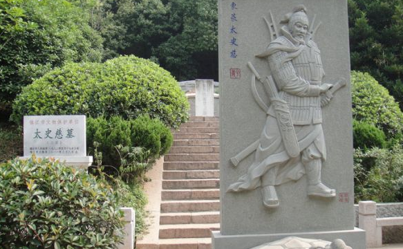 太史慈(166——206年)字子义,东莱黄县(今山东)人。东汉末年武将,官至建昌都尉。弓马熟练,箭法精良。太史慈墓位于江苏镇江市北固山中峰南麓,墓高1.7米,直径约3米,建于长6.7米、宽7.4米的石平台上,北面挡土墙长6.8米,高2米左右不等,墓前有高1.43米、宽约0.7米的大理石碑,上面刻着7个大字“东来太史慈之墓”。太史慈墓早已不见,1872年修筑城墙时发现,后屡次修治。抗战前,曾修葺一新,建国初,因塌山被埋没。现墓于1985年重建。
