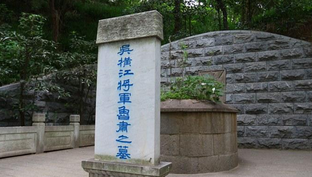 鲁肃(172—217),临淮郡东城县(今安徽定远)人,早年因资助周瑜,与周瑜结交深厚;东汉建安五年(200年)投奔孙权,因才得到赏识。赤壁大战前,鲁肃和周瑜为主战派,战后受到孙权的重用。周瑜死后,鲁肃出掌兵权,与关羽相持,互有胜负。此墓位于镇江市北固山,但由于战乱,原墓地已经不知所踪,如今位于北固山上的鲁肃墓是近代所立。