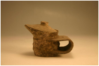 图为镇江博物馆馆藏新石器宽把带流黑陶盖杯,此杯盖面弧曲,顶设圆钮。器侈口,前侧有一上斜的长流,束颈,腹略外弧,矮圈足。腹后设半环形宽, 面上方镂双孔,两侧刻划两组竖线纹。这件黑陶盖杯是日常生活常用的一种饮水器,也用于饮茶。