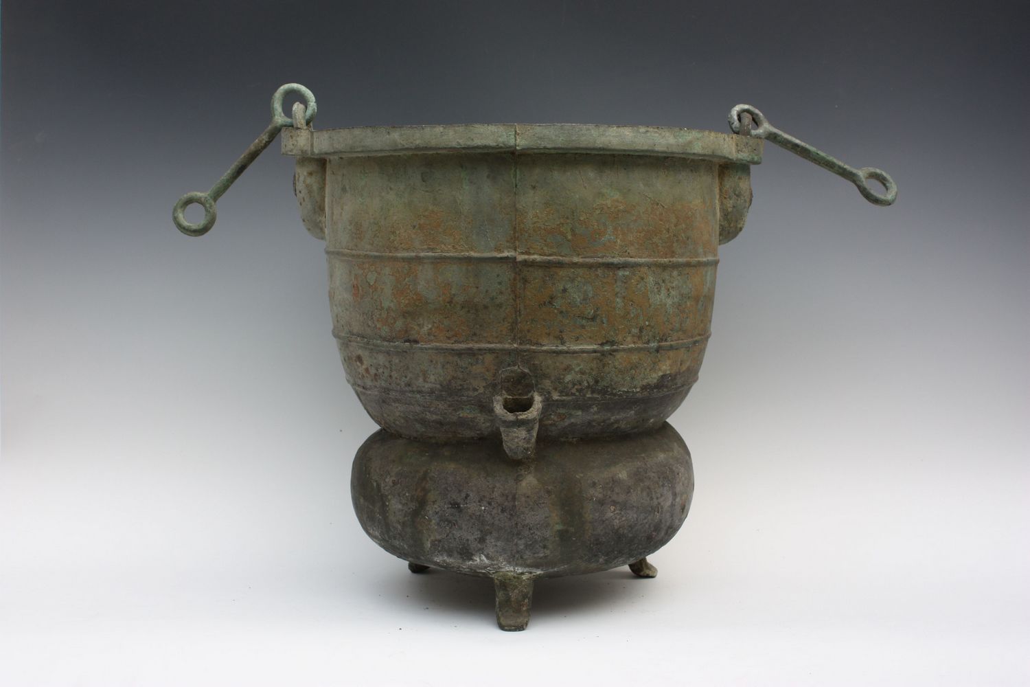 1979年3月镇江丹徒谏壁粮山大队出土一件青铜带流甗。器体为合体式,上为甑,下为三足釜,口沿凸出一圈可以承盖,两旁鼓出双耳,上扣两个吊链,腹上有凸弦纹三道,釜作扁圆形,三短蹄足,在甑釜相接的内部有八个凸出的半圆形托,用以托箅,外部有一注水口。釜底有很厚的烟炱痕迹,器盖和箅均无,可能属于竹木制品,已腐烂无存。