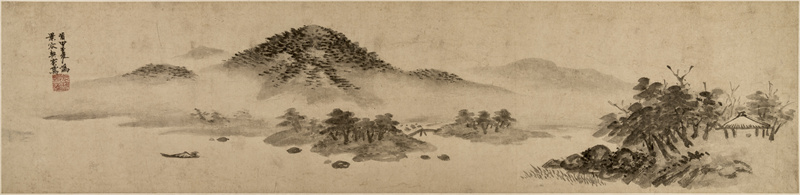 李在(1400-1487),字以政,讳春谷,号龙波居士,今福建莆田人。宣德年间被征召入京,任仁智殿待诏,与戴进、周文靖并驱,工山水,宗法郭熙、马远,兼善人物,笔法简劲流畅。此卷仿“米氏云山”风格,以米点皴作树石远山,云气缭绕,空濛飘渺,在其传世作品中未曾见过此种面貌。画面左上方自题“莆田李在为景容契家写”,下钤“妙在化机之先”朱文印。
