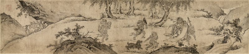 殷善(约1380-成化年间),字从善,一字仲之,金陵(今江苏南京)人。永乐初年至天顺四年供职于宫廷,历经六朝,官至府军卫指挥同知,画史载其工山水人物、花果翎毛,风格极富清致,神采独异。此卷写“五鬼闹判”场景,钟馗与小鬼衣纹线条流畅,多采用钉头鼠尾描,形象生动,富有质感,技法接近南宋院体风格。画作未署名款,仅钤“殷氏从善”白文印一方,结合内容与功能来看,在收藏属性之外,还可能为驱邪傩戏的代用品。