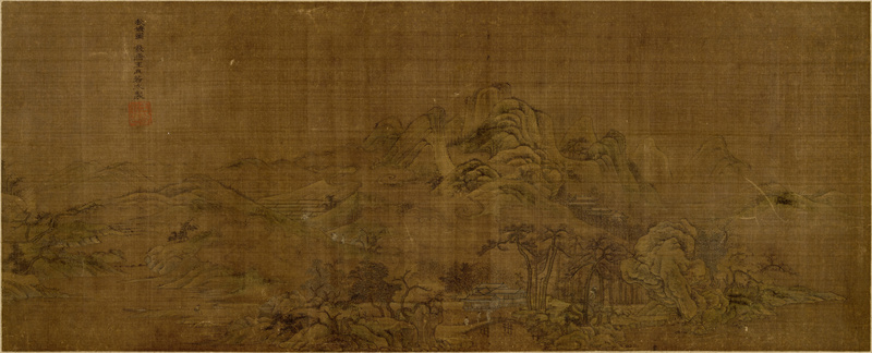 此卷山水画为绢本淡设色,近处绘有虬枝烟树,坡石错落,数间草舍隐落于树石之中,远处山峦起伏,钓舟泛于溪中。卷中长松勾皴苍劲,以浓墨勾勒枝干,向下垂仲形似蟹爪,曲直相间。山石以渴笔中锋作卷云皴,舒卷流畅,与蟹爪树法形成互补。此幅作品无名款、钤印,若从书画本身的风格气息和技法来判断,应当为元末至明初唐棣传派的佳作。