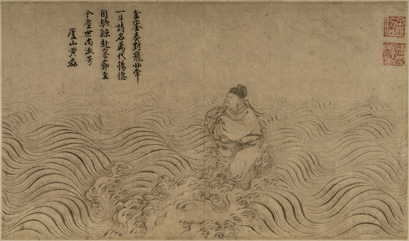 徐良(生卒年不详),画史无考。此作写谪仙人李白醉后捞月,骑鲸飞升的典故,画中水波变化无常,人物衣纹线条流畅,笔法如行云流水,落笔处形神兼备。卷中未署名款,仅钤“孟昭”“徐良图书”白文印二方。左侧有庐山黄磊题诗曰:“金銮奏对宠非常,一斗诗名万代扬。忆自骑鲸赴寥廓,至今尘世尚流芳”,具有羽化登仙,超脱生死之意。