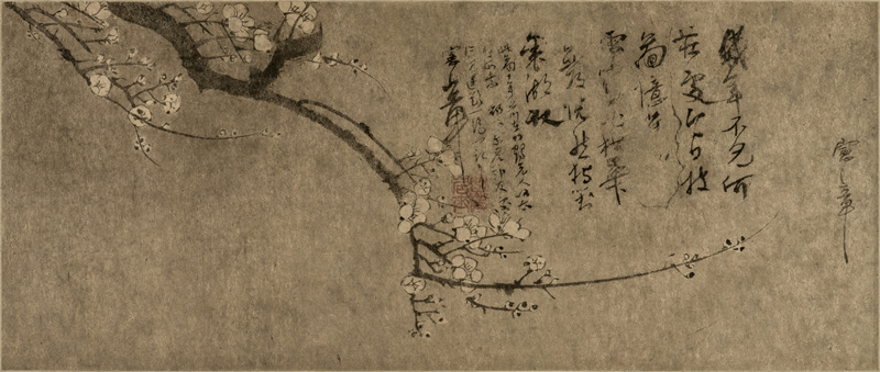 陈录(生卒年不详),字宪章,以字行,号静斋、如隐居士,会稽县(今浙江绍兴)人。善画墨梅及松竹兰蕙,笔意儒雅,画梅与王谦齐名,而宪章笔力尤劲,兼工诗文。此幅画卷作墨梅一枝,以截取之势横斜而下,枝干遒劲,挥洒自如,写梅花繁而不乱,布局巧妙,相映得趣。从陈宪章自题诗文中可知此图是作予“竹鹤老人”何澄的,后辗转为景容所有,中间钤有“如隐居士”朱文印,整体上诗书画印具于一体,意蕴深厚。